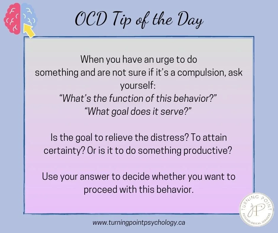 OCD Tip of the Day: Function Defusion Feb 7 Written By Turning Point Psychological Services For other OCD Tips, visit OCD Tips of the Day Turning Point Psychological Services https://www.turningpointpsychology.ca/